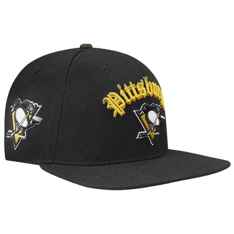 NHL PITTSBURGH PENGUINS OLD ENGLISH UNISEX 6 PANEL SNAPBACK HAT (BLACK)