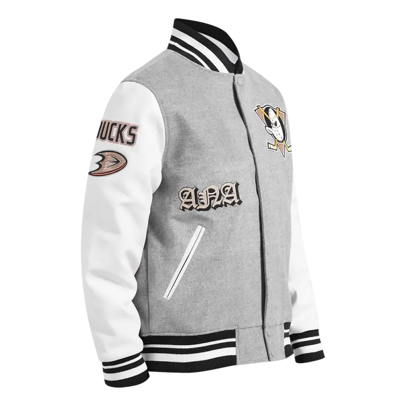 The Pro Standard Premium NHL Anaheim Ducks Old English Men’s Rib Wool Varsity Jacket (Black/Orange)